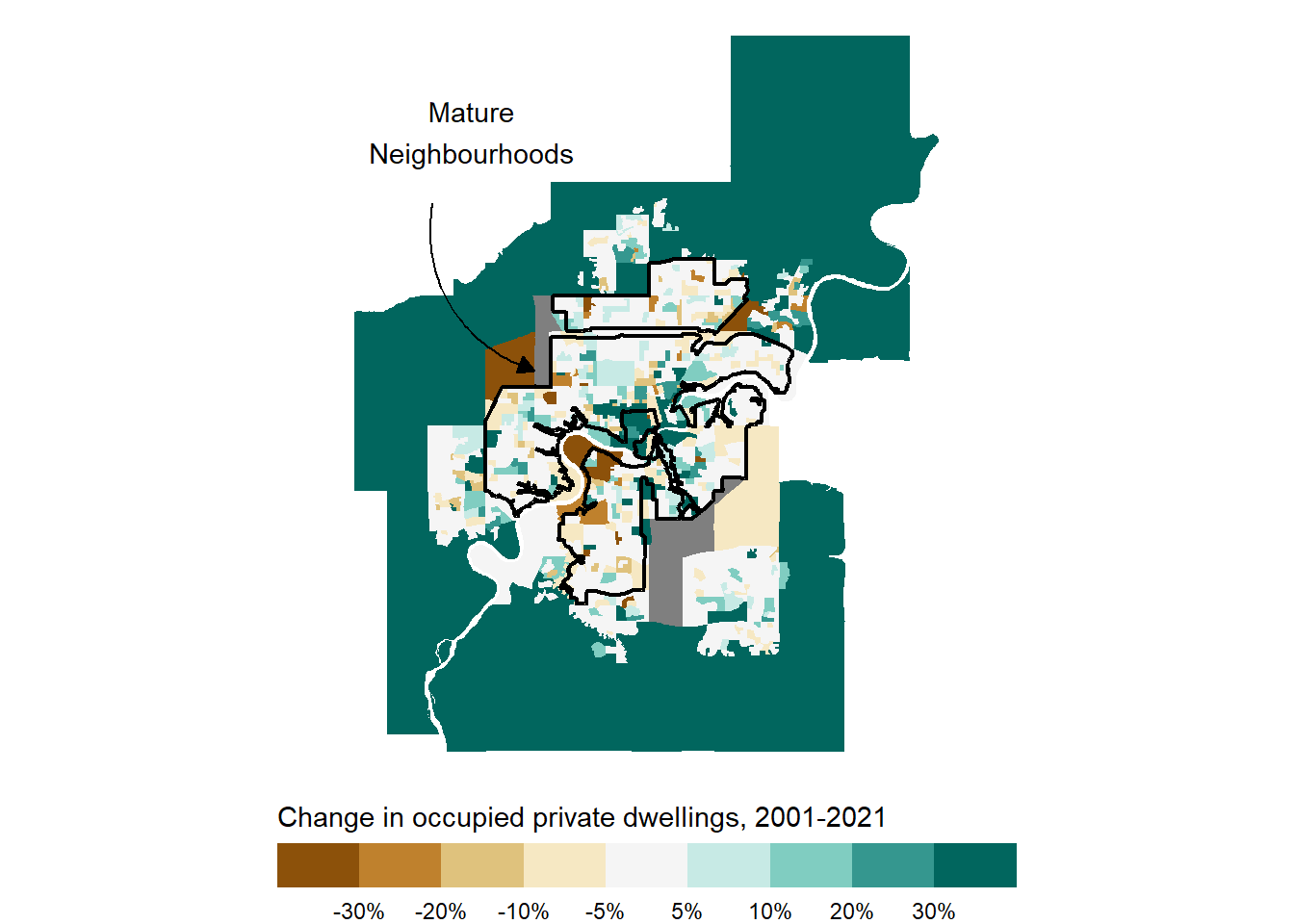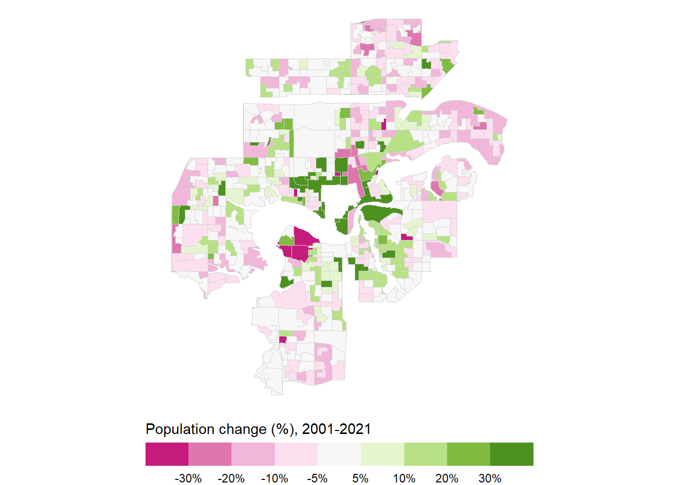 Figure 2: Population change (%) from 2001-2021 in mature neighbourhoods