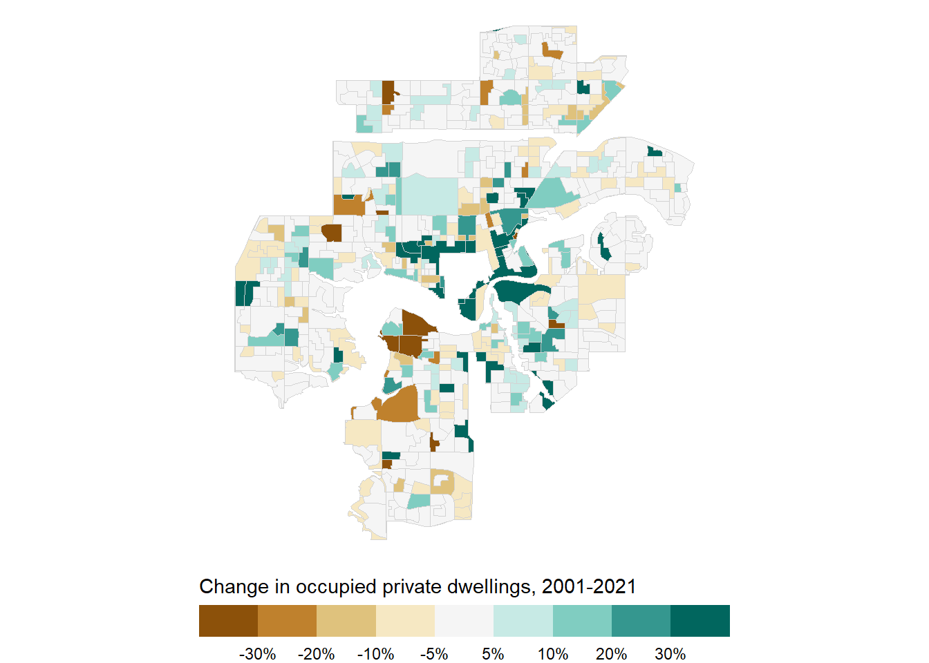 Housing growth mirrors population growth as one would expect. Besides the outer suburbs, housing growth in most areas of Edmonton has stagnated as shown in Figure 3.