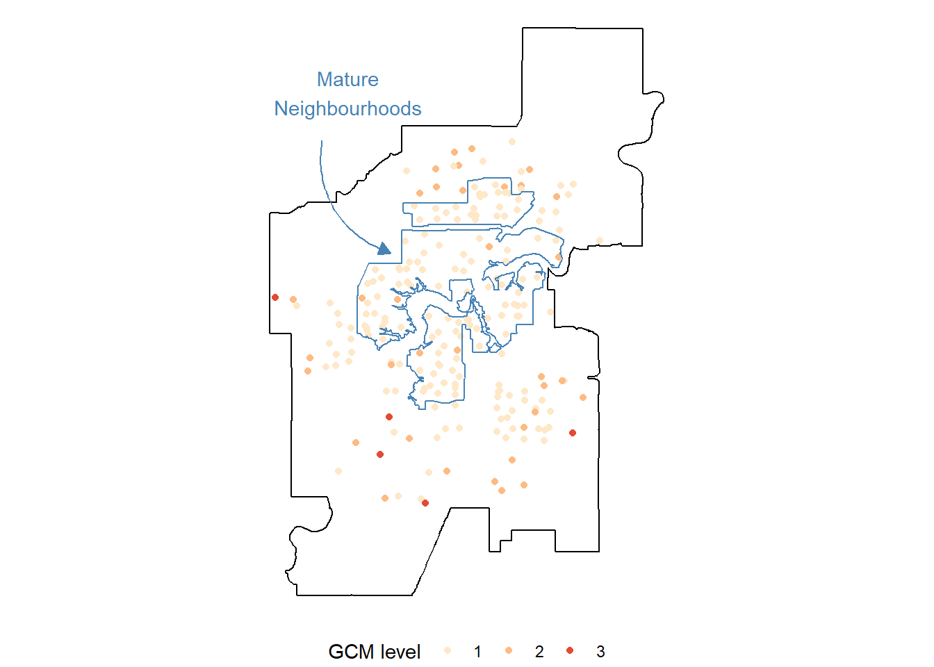As shown in Figure 5, most schools are at GCM level 1, however, there are far more schools at GCM level 2 and 3 outside mature neighbourhoods than within. Very few schools are above GCM level 1 within mature neighbourhoods.