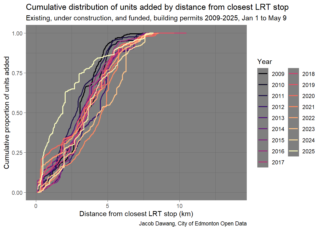 Figure 5: Cumulative distribution of units added by distance from the closest existing LRT stop