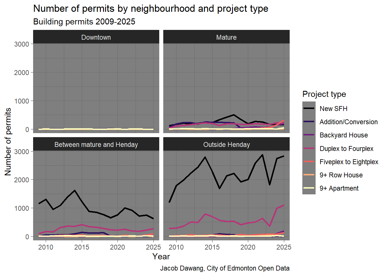 Both the project type and neighbourhood type categories are arbitrary, but I think they strike a good balance for examining the effect of ZBR, the ascendance of backyard homes, and Edmonton’s development pattern.