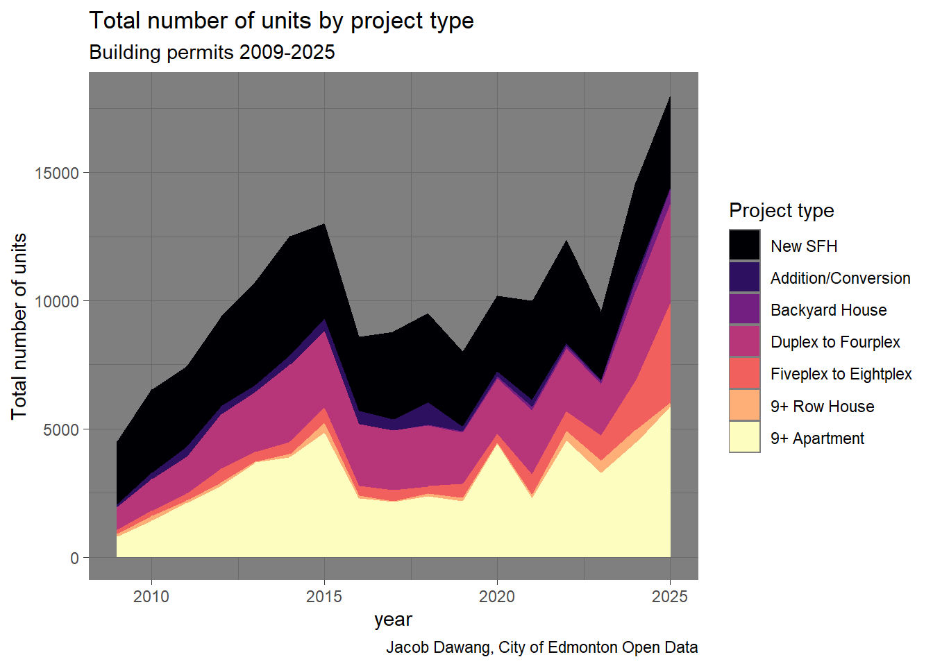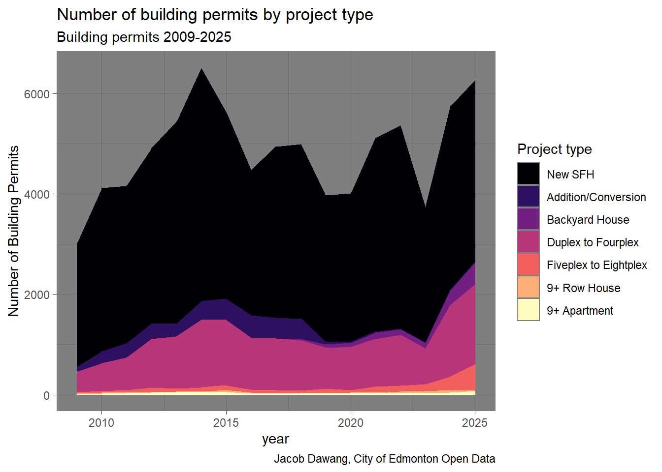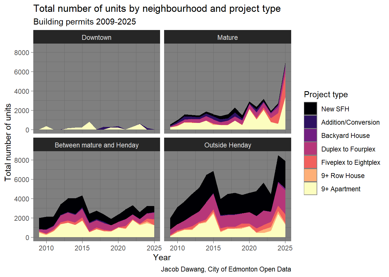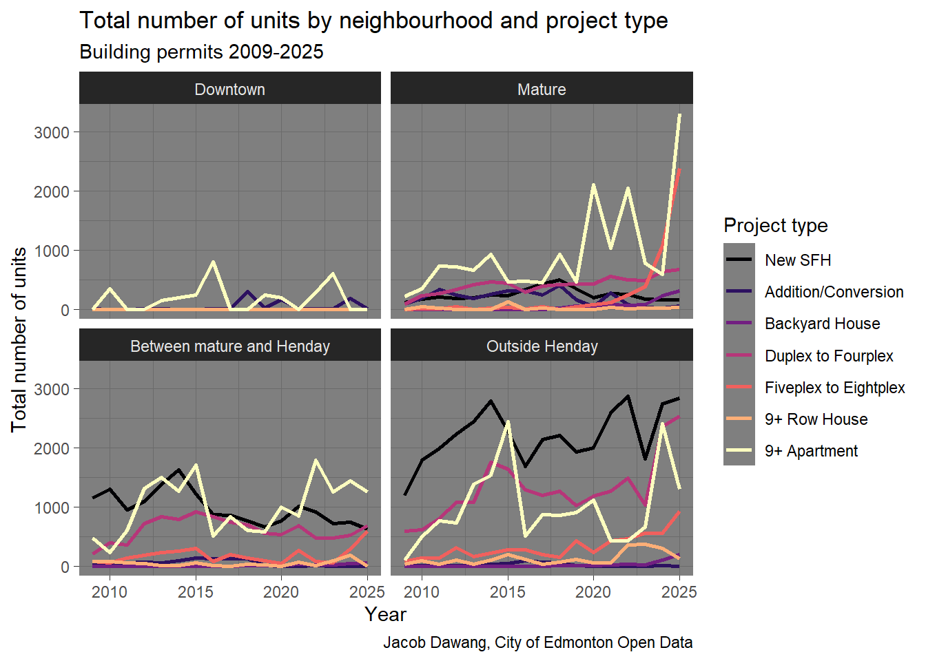 There is an increase in housing production in mature neighbourhoods, to the point where it’s only about a thousand units less than outside the Henday. Driving this increase is 9+ apartments and fiveplex to eightplexes. Remember, increasing the number of fiveplex to eightplexes was one of the main goals of ZBR. Clearly a ton of people had latent demand to live in this kind of housing in mature neighbourhoods and this is enabling more people to live the kind of life they want to live at a more affordable price.