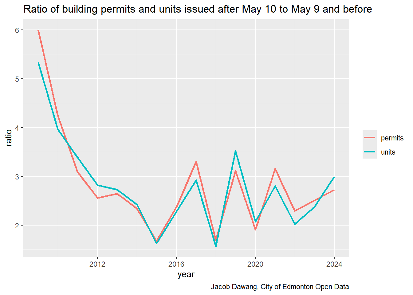 Figure 1: Ratio of building permits and units issued after May 10 to May 9 and before