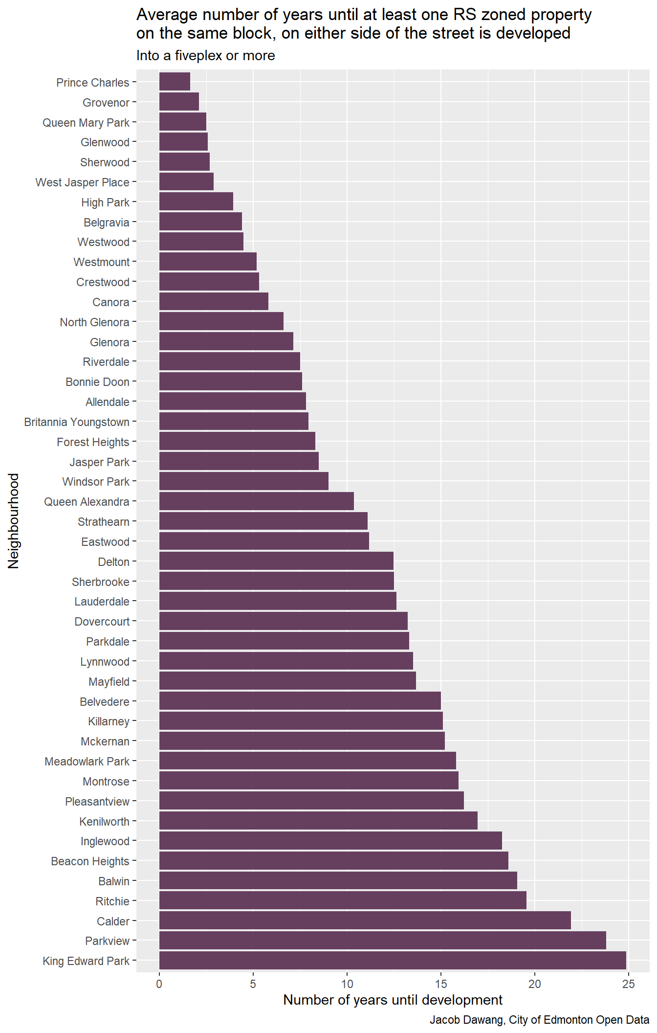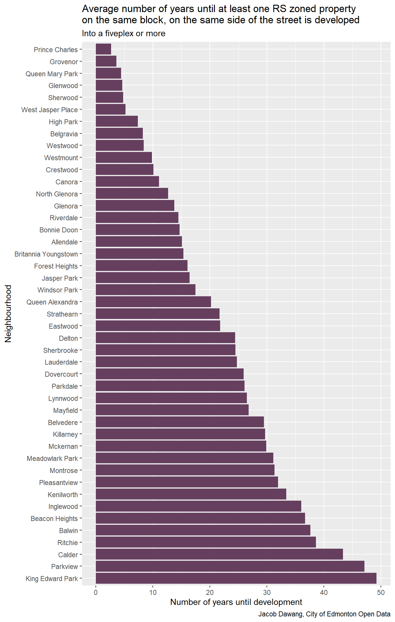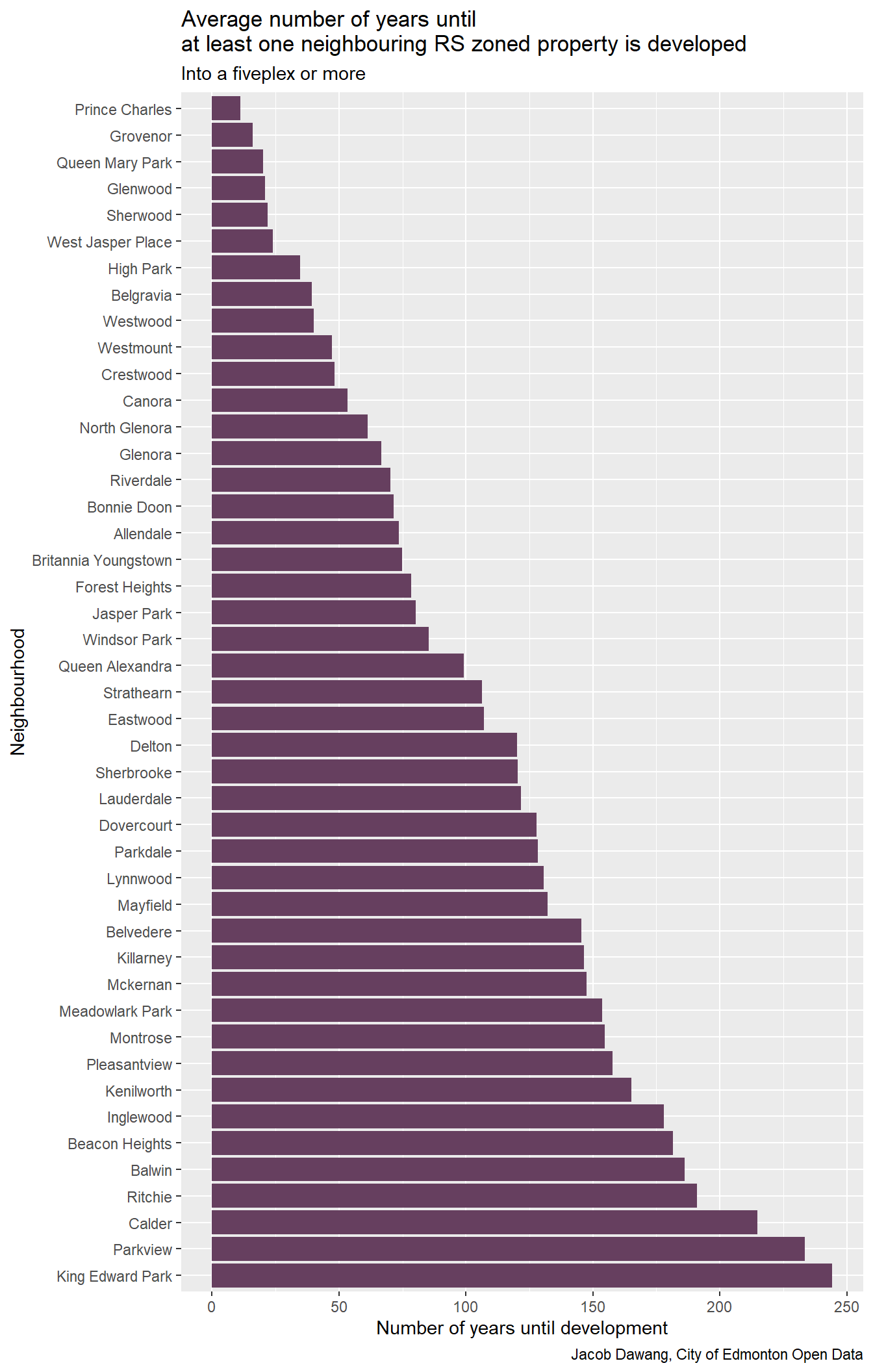 Figure 7: Average number of years until at least one neighbouring RS zoned property is developed into a fiveplex or more