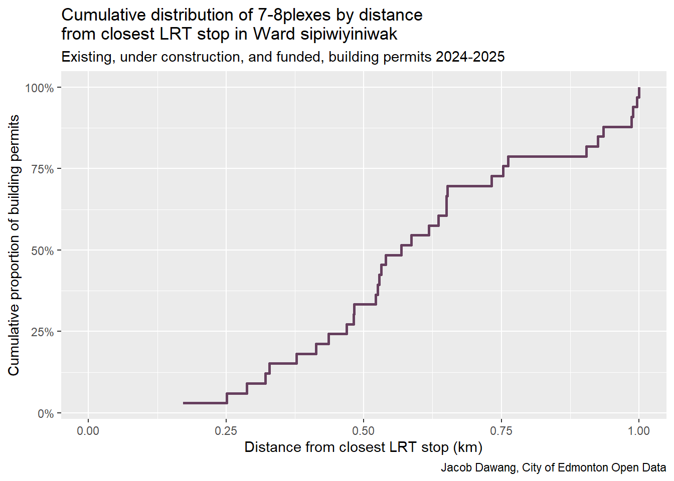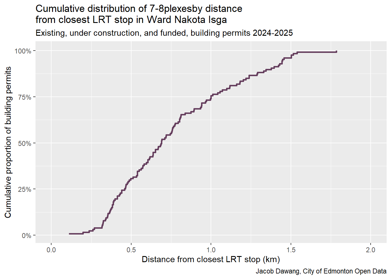 The cumulative distribution plot in Figure 8 confirms that 7-8plexes are built close to LRT, even more than in Ward Nakota Isga. 75% are within 750m and 100% have been built within 1km.