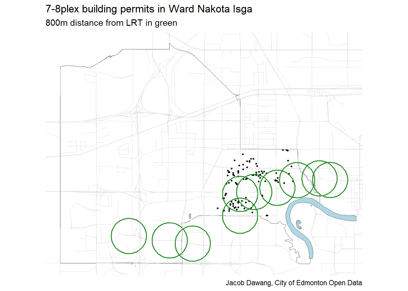 It’s impossible to talk about infill in Ward Nakota Isga without talking about the Valley Line West LRT. Figure 3 shows a clear relation between the path of the LRT and where 7-8plexes are being built.