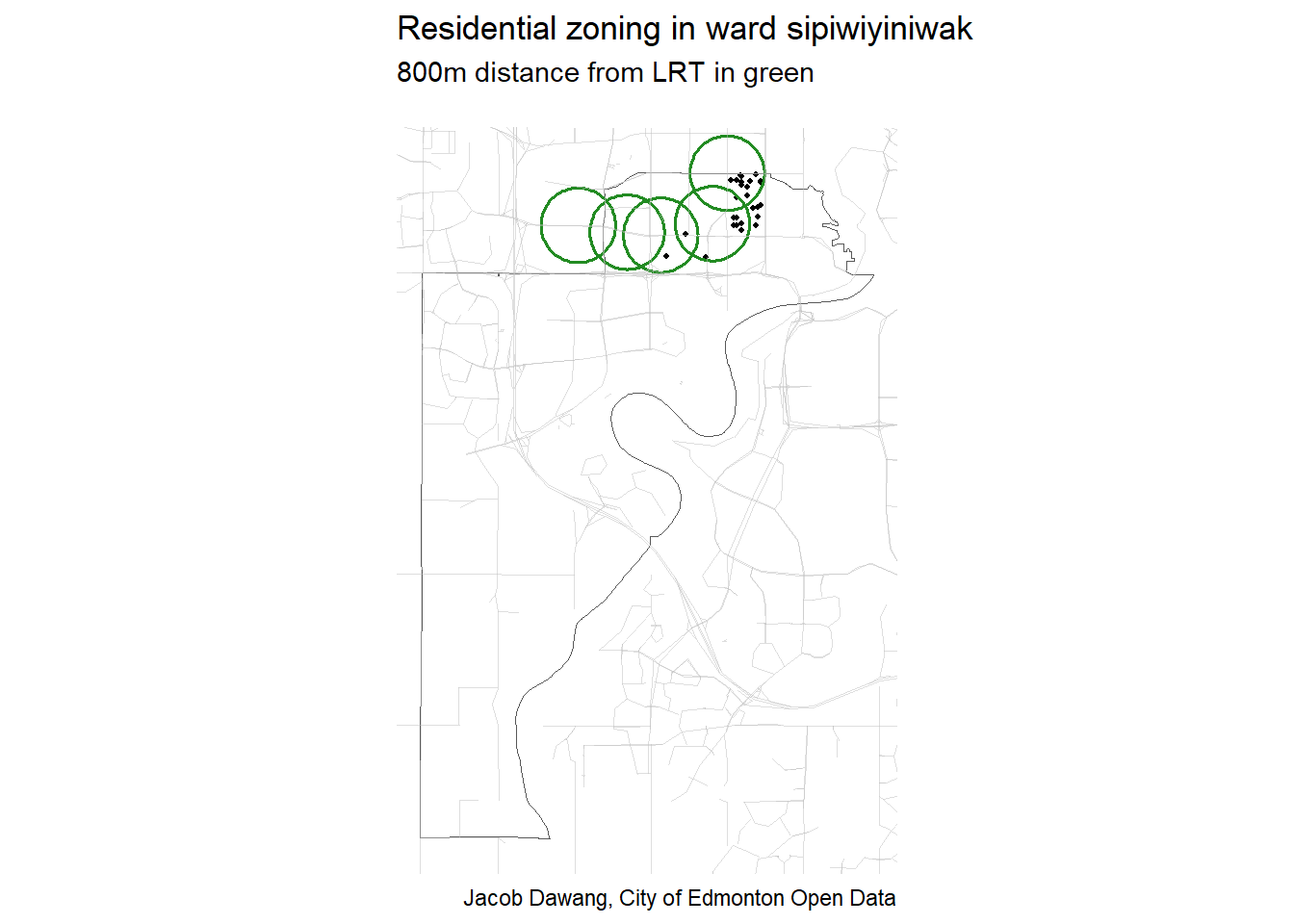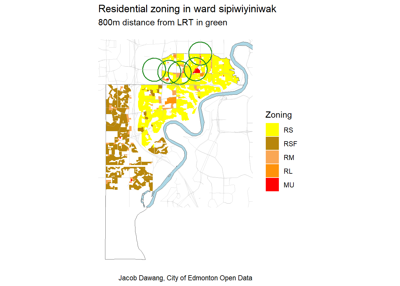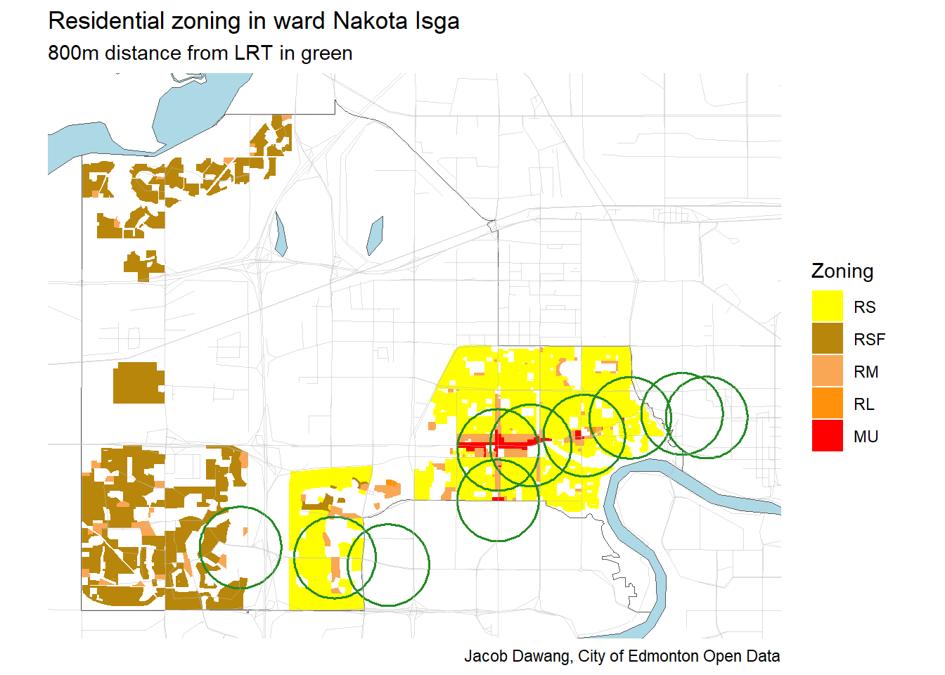 Figure 2 shows that a lot of the ward is zoned RS. But, also a huge proportion of the RS-zoned land is within 800m walking distance of LRT, as shown by the green circles in the image.